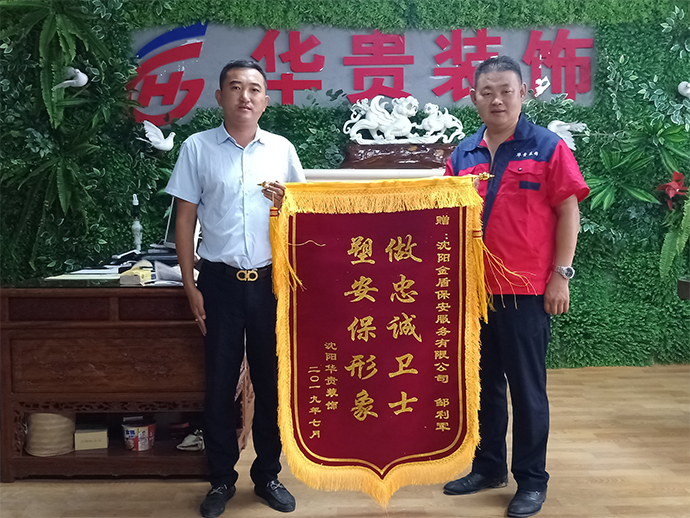 他们似乎忘记了高温的威胁,坚持六天监守在浑南快速路上。不辞辛劳,任劳任怨的态度打动了现场相关领导。浑南快速路施工方华贵装饰李领导于8月15号将一面写有:"做忠诚卫士,塑安保形象"的锦旗赠予警盾保安邹利军,以对邹利军保安队长领导有方,执行力强,服务贴心进行表扬。